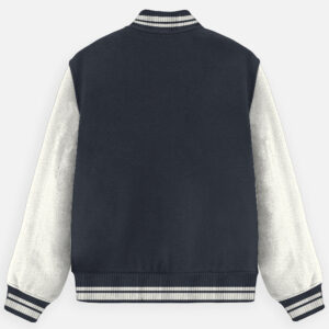 Design: Sleek navy base with light sleeves, urban snap-front closure, ribbed varsity stripes, and roomy pockets.